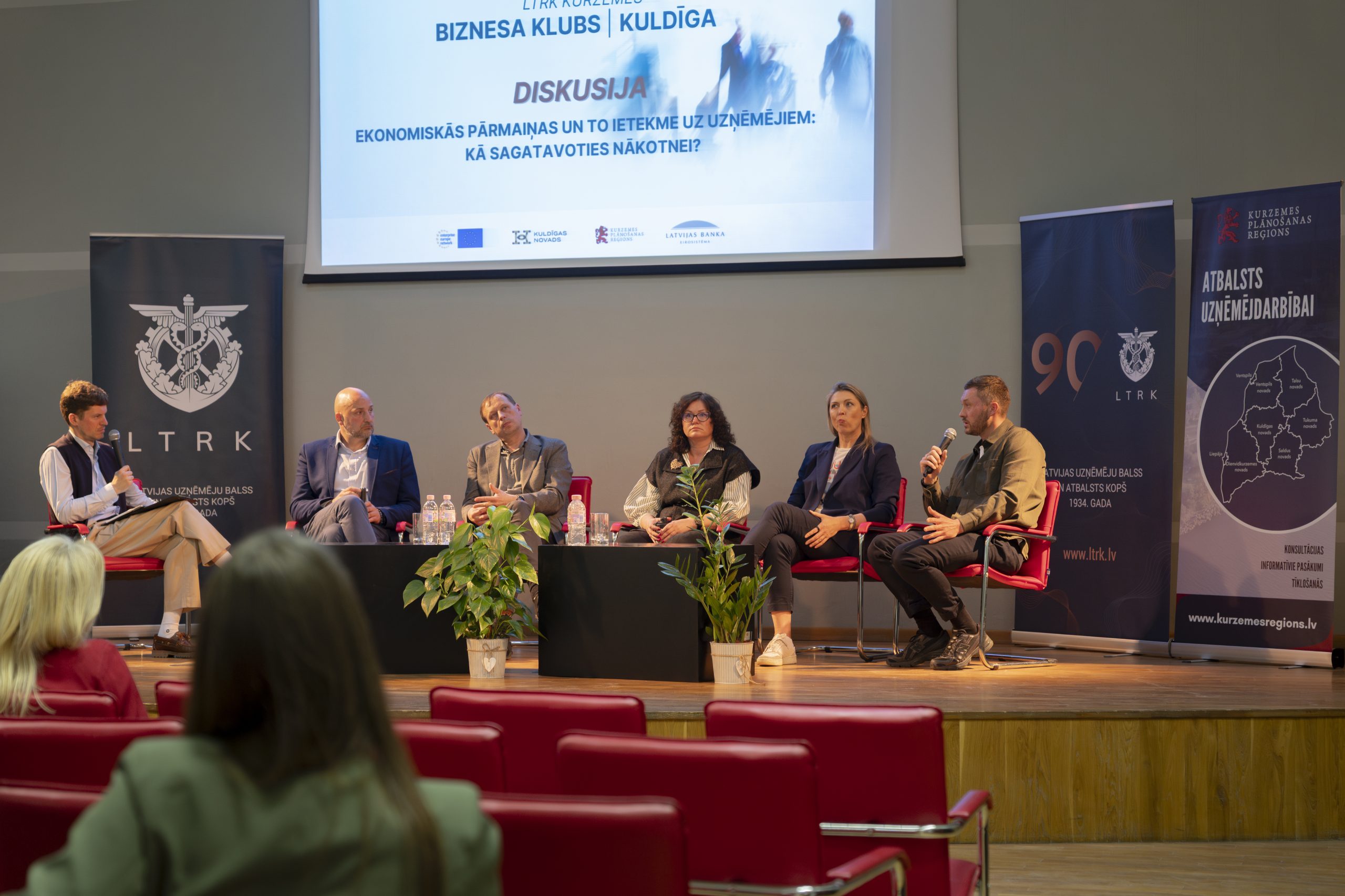 Pasākuma turpinājumā diskusijas “Ekonomiskās pārmaiņas un to ietekme uz uzņēmējiem: Kā sagatavoties nākotnei?” dalībnieki – Ārlietu ministrijas ārējās tirdzniecības un ārējo ekonomisko sakaru veicināšanas departamenta direktors Ģirts Jaunzems, Latvijas Bankas ekonomiste Agnese Puķe, NATO Stratēģiskās komunikācijas izcilības centra Vecākais politikas un pētījumu vadītājs Jānis Karlsbergs, Timberteh valdes loceklis Toms Egle, Starptautisko biznesa pakalpojumu asociācijas “ABSL Latvia” valdes priekšsēdētāja Aļesja Kirčenko – moderatora, LTRK valdes locekļa Jāņa Lielpētera, vadībā aktīvi diskutēja par ekonomikas pārmaiņu ietekmi uz uzņēmējdarbību, sniedzot praktiskus risinājumus un stratēģijas, kas palīdzēs uzņēmējiem pielāgoties mainīgajiem apstākļiem.