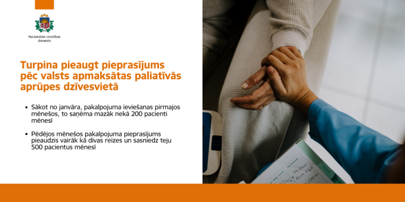 Pusgadu pēc paliatīvās aprūpes pakalpojuma pacienta dzīvesvietā iekļaušanas valsts apmaksāto pakalpojumu klāstā, turpina pieaugt pieprasījums pēc šī aprūpes veida. Šobrīd paliatīvā aprūpe ir pieejama visos Latvijas reģionos un līdz jūnijam to ir saņēmuši 850 pacienti, liecina Nacionālā veselības dienesta (NVD) apkopotie dati.